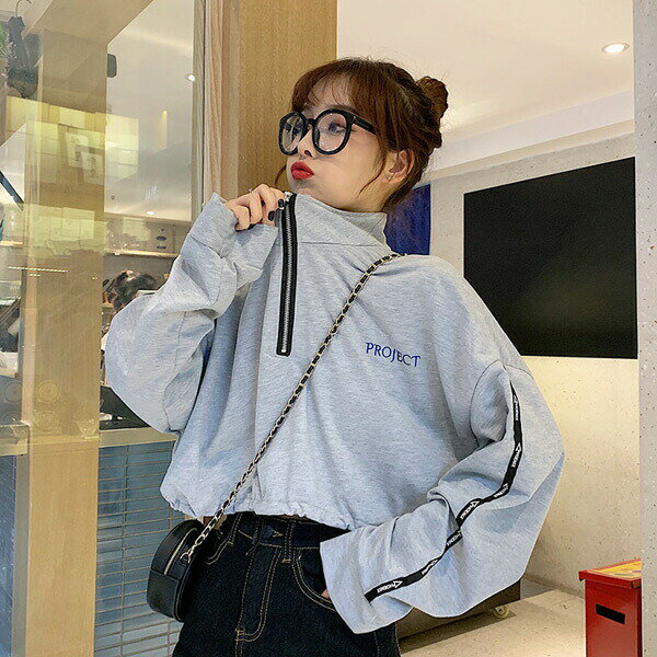 【即納あり】 ハーフジップ ショート丈 トップス ハイネック 長袖 ブラック グレー ダンス 衣装 ヒップホップ コスチューム 韓国ファッション 大きいサイズ 個性的 服