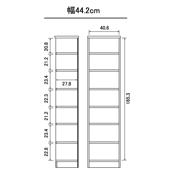 カラーナチュラル/ホワイト/ブラウン/ダークブラウン/ライトナチュラルサイズW44.2×D31.0×H178.0cm内 寸W40.6×D27.8cm(有効実寸)重 量20.3kg材 質プリント紙化粧繊維板塗 装ウレタン樹脂塗装特 長組立時間45分/2人移動棚板4枚、可動固定棚2枚耐荷重左の耐荷重基準値表を参照