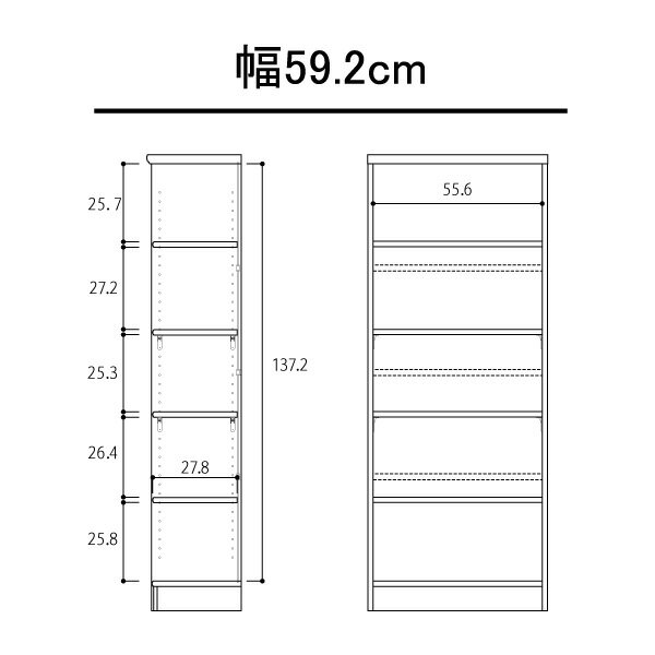 カラーナチュラル/ホワイト/ブラウン/ダークブラウン/ライトナチュラルサイズW59.2×D31.0×H149.9cm内 寸W55.6×D27.8cm(有効実寸)重 量16.9kg材 質プリント紙化粧繊維板塗 装ウレタン樹脂塗装特 長組立時間30〜60分/1人移動棚板2枚、可動固定棚2枚転倒防止補助バンド付 耐荷重左の耐荷重基準値表を参照