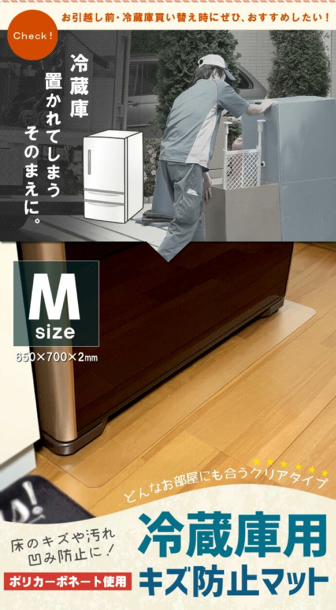 ) 商品詳細 冷蔵庫用キズ防止マット Mサイズ 65×70cm 透明 お引越しや冷蔵庫の買い替え前に 【キズ・ヘコみを防ぐ】冷蔵庫を設置した際に生じるキズやヘコみを、マットが防ぎます 【透明マット】ガラスのようなクリア素材なので、透明でどんなお部屋にも合いやすい 【ポリカーボネート使用】耐衝撃性が高く、耐熱性や耐候性にも優れているので、劣化しにくい 規格 size:約65×70cm 厚さ:約2mm 素材:ポリカーボネート ※サイズは全て外寸になります。