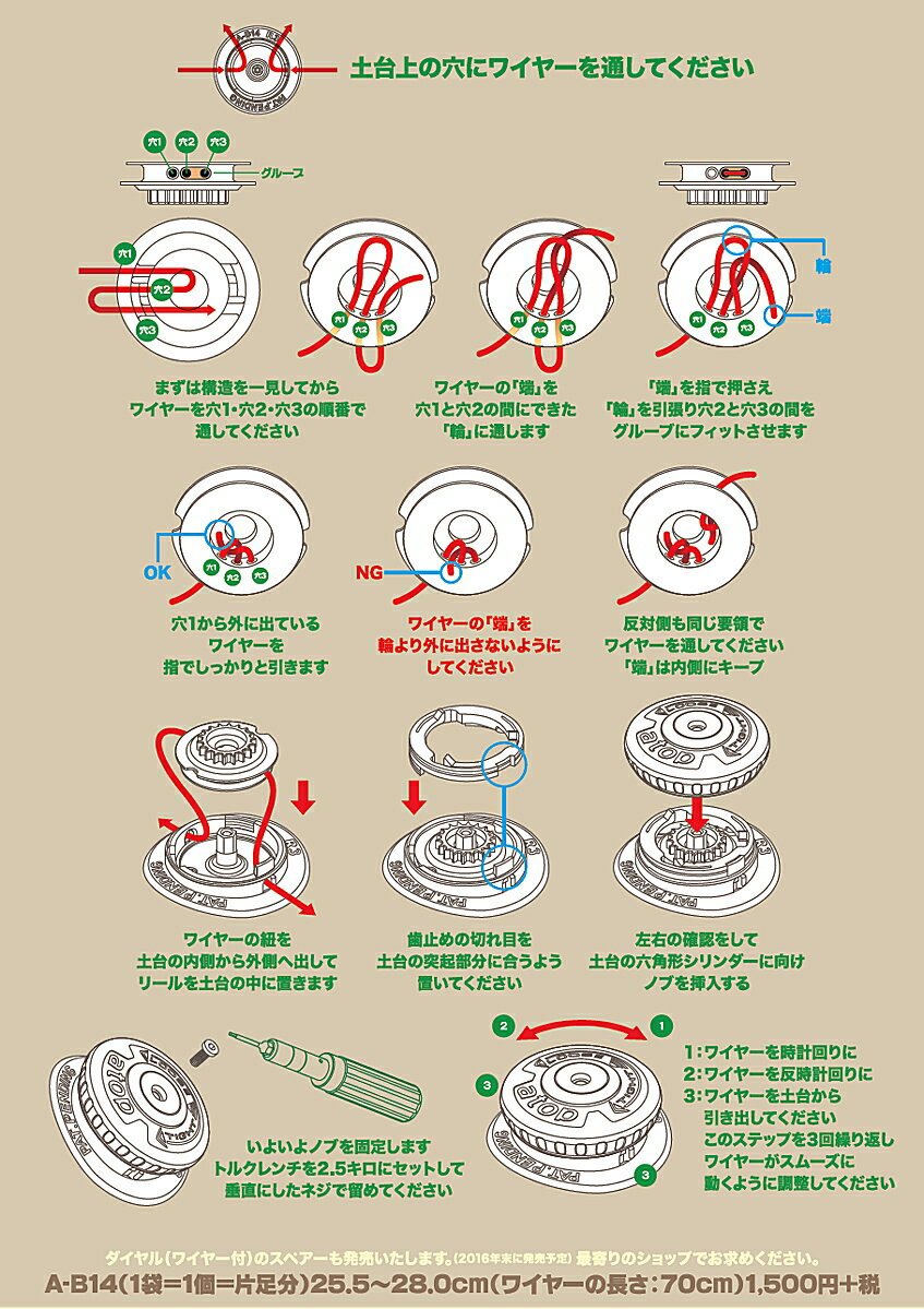 【ダイヤル仕様シューズの補修部品(ワイヤー付き)】 品番:A-B14(Ds200用)交換用ダイヤル (atop社製) サイズ: 【70】:25.5〜28.0cm用 ワイヤー長さ70cm ワイヤー付き、1袋1個入り(片足分)、工具付き メール便発送も対応いたします。
